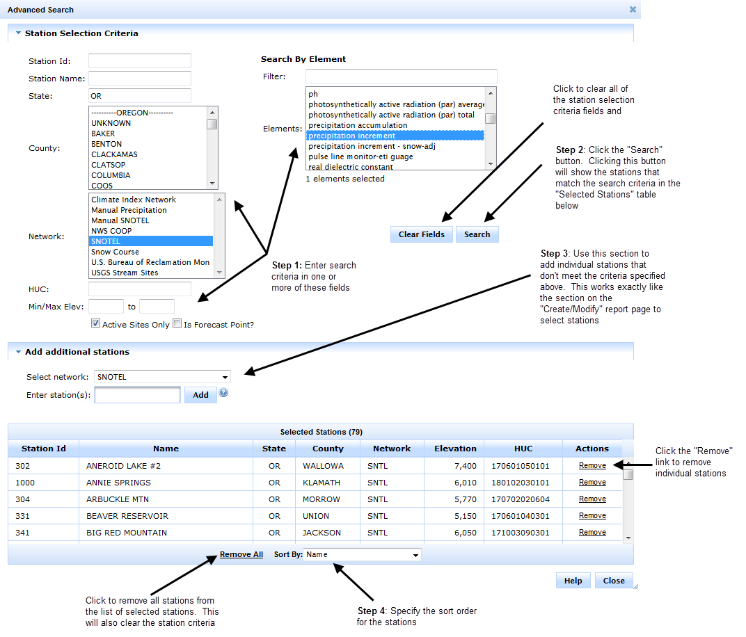 Sometimes you will need to add stations to your selection that do not match your selection criteria. For example, lets say you wanted all of the SNOTEL stations in Oregon, but also wanted to include one station from Washington. In this case, you would set the "State" field to "OR" and select the "Network" "SNOTEL", hit the "Search" button, and then add the additional station using the "Enter station(s)" input field in the "Add additional stations" section. This section works the same way as the way you enter stations on the main "Create/Modify report" page. You simple pick a network in the "Select Network" pull down, and then enter the first couple characters of the station id or station name of the station you want to add and then click on the station that you want to add. Add stations that are added individually can be removed individually by clicking on the "Remove" link that is in the "Actions" column in the table of selected stations. Stations in the table that are a result of the station selection criteria will not have anything in the "Actions" column.